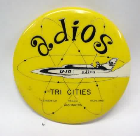 1958 ADIOS Tri-Cities. black and white on yellow. original issue. illustration of U-10 in center. 2.25" diameter celluloid pinback. reverse is clean. no flaws. bright and clean. near mint to mint. 45.00