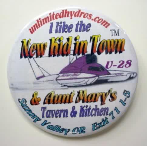 2000 NEW KID IN TOWN U-28 AUNT MARY'S TAVERN & KITCHEN hydroplane pinback button. Not catalogued. 2.25" diameter celluloid. reverse is clean; no rust. colors are bright and strong. no flaws. Superior condition. sorry sold