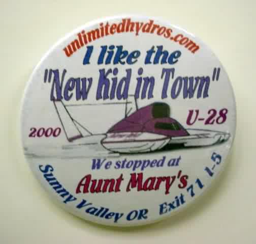 2000 NEW KID IN TOWN U-28 AUNT MARY'S hydroplane pinback button. Not catalogued. 2.25" diameter celluloid. reverse is clean; no rust. colors are bright and strong. no flaws. Superior condition. 5.00