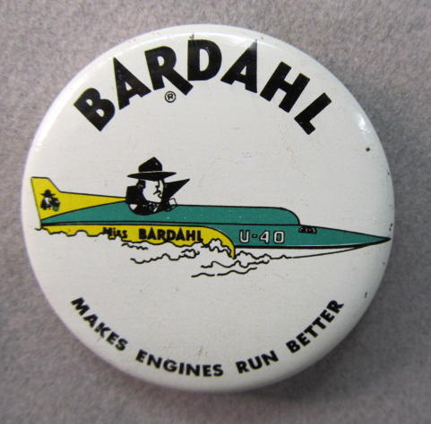 1963 BARDAHL. "Makes Engines Run Better". illustration of the U-40 Hydroplane with the "Dragnet Man" driving. 2.25" diameter tin litho. near mint to mint. 25.00
