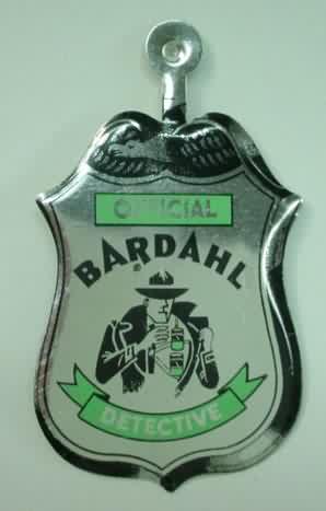 circa 1959 BARDAHL OFFICIAL DETECTIVE badge. green and black on silver. badge shaped tab. approx. 2.5" by 2". unfolded. excellent or better. colors are strong and clean. 12.00