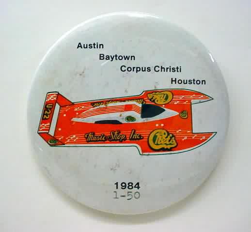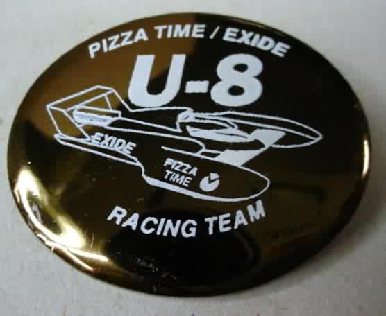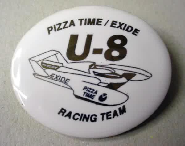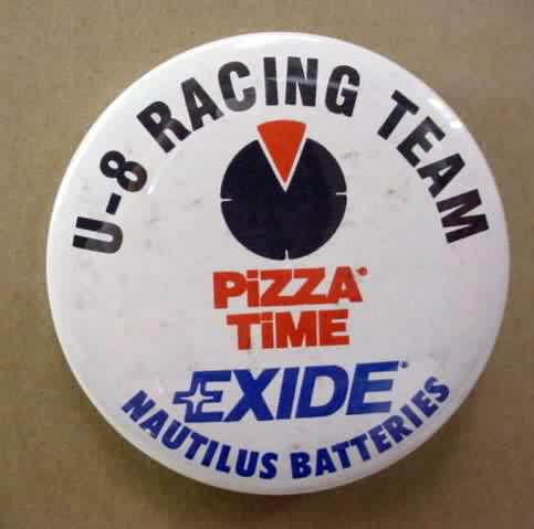 1995 PIZZA TIME EXIDE U-8 RACING TEAM hydroplane pinback button. 2.25" diameter celluloid. reverse is clean; no rust. colors bright and vivid. no flaws. superior condition. 7.00