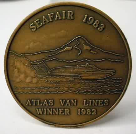 coin. 1.5" diameter bronze. Raised lettering and images. Obverse has SEAFAIR SEA GALLEY EMERALD CUP. The reverse says SEAFAIR 1983 - ATLAS VAN LINES WINNER 1982 with image of the ATLAS VAN LINES race boat with Mount Rainier in distance. Near mint to mint. no flaws. Appears to be uncirculated. 5.00