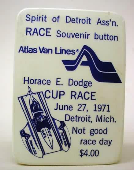 pin. SPIRIT OF DETROIT ASS'N. RACE Souvenir Button. ATLAS VAN LINES with illustration of the boat. HORACE E. DODGE CUP RACE. June 27; 1971. Detroit Mich. blue on white. celluloid pinback button. rectangular shape. approx. 2" by 3". near mint to mint. no flaws. 6.00