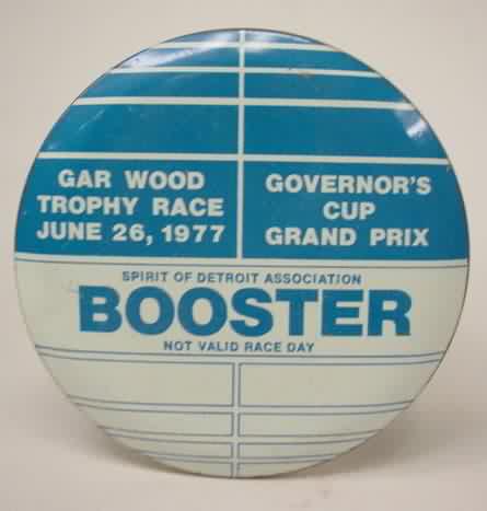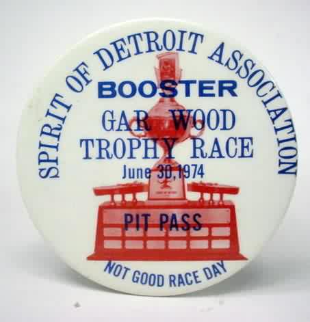 pin. Spirit of Detroit Association BOOSTER - GAR WOOD RACE July 1; 1973. 5 Time Gold Cup Winners. PIT PASS. Portrait photos in the center of GAR WOOD and BILL MUNCEY. blue and red on white. celluloid pinback button. 3" diameter. Near mint to mint. no flaws. 14.00