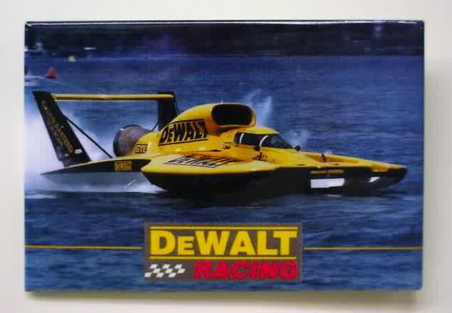 1997 DeWALT RACING hydroplane related pinback. full color photo of the boat with DeWalt logo below. approx.3.125" by 2.125" rectangle celluloid. reverse is clean; no rust. no flaws. superior condition. 5.00