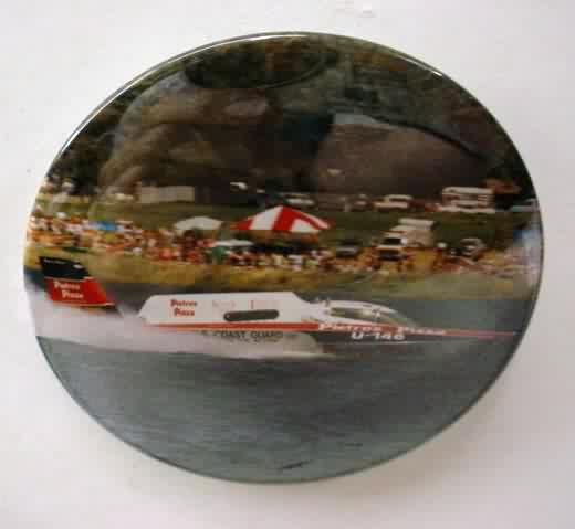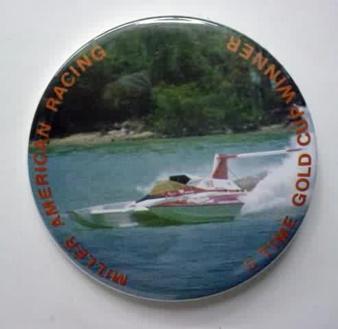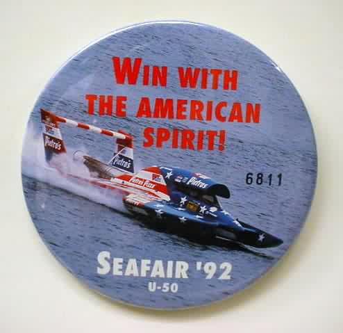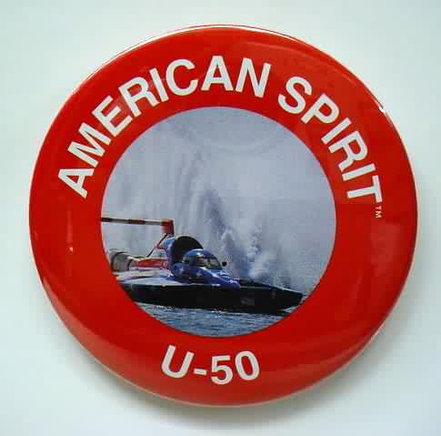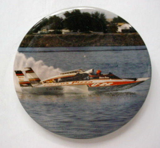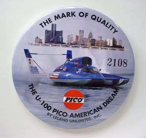 1998 PICO AMERICAN DREAM U-100 serial number #2108 hydroplane pinback. full color action photo. 3" diameter celluloid. reverse is clean; no rust. no flaws. superior condition. 8.00