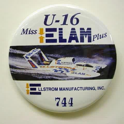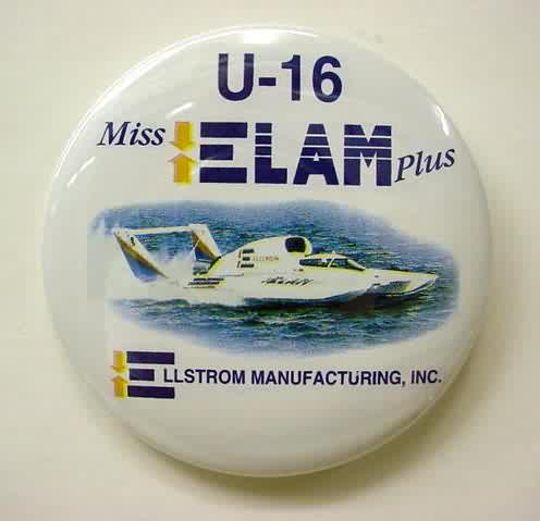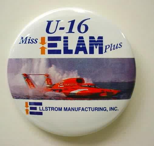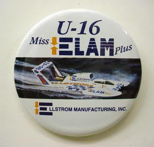 1996 MISS ELAM PLUS hydroplane pinback button. full color photo of the boat. NOTE that the U-16 is NOT in italics at the top; as opposed to the numbered variant. 2.25" diameter celluloid. reverse is clean; no rust. colors strong. no flaws. superior condition. 8.00