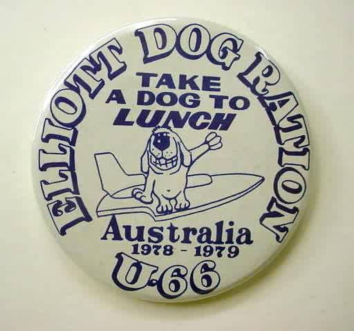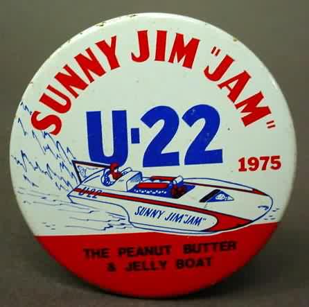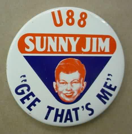 1974 SUNNY JIM U-22. gold back. red and blue on white. 2.25" diameter tin litho. excellent plus to near mint. 5.00