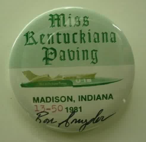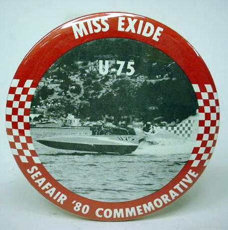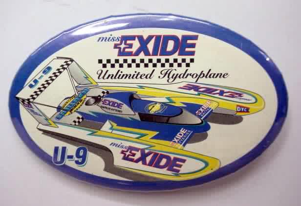 1996 MISS EXIDE numbered #18 rectangle hydroplane pinback. Color action photo. #18 of an issue of 50. approx. 2.75" by 1.25" celluloid. reverse is clean; no rust. no flaws. superior condition. sorry sold