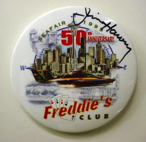 1999 FREDDIE'S CLUB SEAFAIR 50th ANNIVERSARY signed hydroplane pinback button. Signed by JIM HARVEY. 3" diameter celluloid. reverse is clean; no rust. no flaws. superior condition. sorry sold