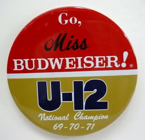 1973 GO MISS BUDWEISER! U-12 NATIONAL CHAMPION 69-70-71 hydroplane boat pin. variation with silver color reverse. Large 4" diameter tin litho pinback button. colors strong and bright. backside is clean; no rust. has 2 very small; minor; dings. near mint. 6.50
