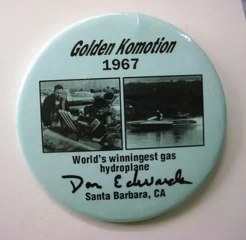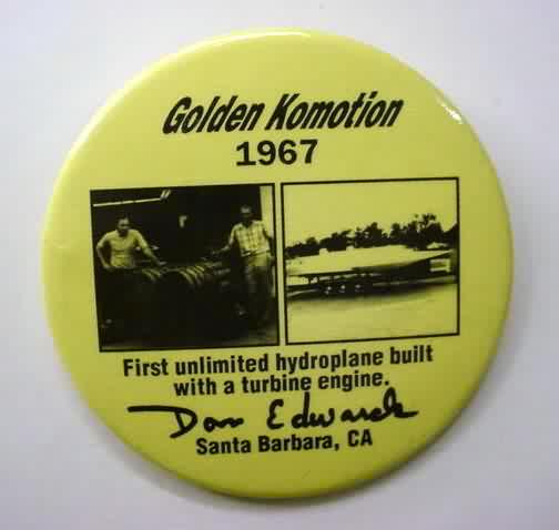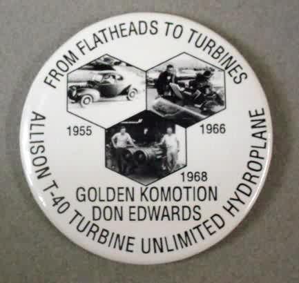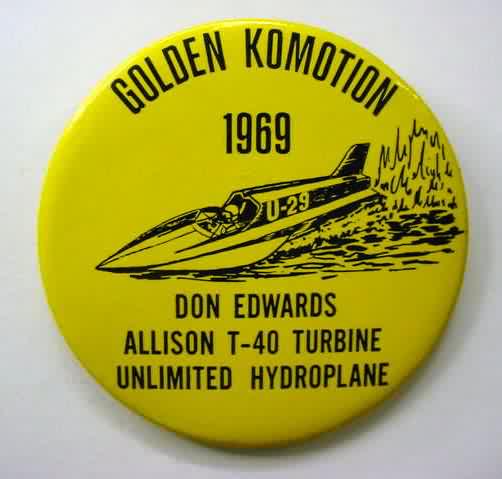 1969 Don Edwards GOLDEN KOMMOTION Allison T-40 Turbine Engine Hydroplane boat racing Pinback Button. black and white. 3" diameter celluloid. "From Flatheads to Turbines 1955 - 1966- 1968". reverse is clean. no flaws. mint condition. not an easy one to find! sorry sold