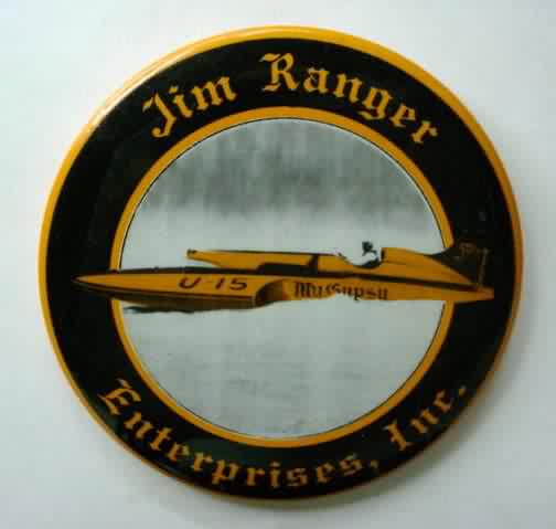 1966 MY GYPSY JIM RANGER ENTERPRISES large round hydroplane pinback button. illustration of boat. Large; 3.5" diameter celluloid. reverse is clean; no rust. no flaws. colors strong and bright. superior condition. 40.00