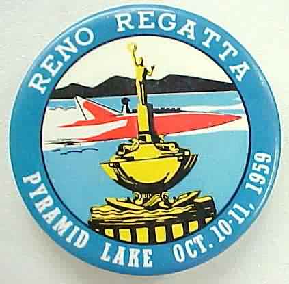 2.5" diameter celluloid pinback button. Multicolored with blue edge. RENO REGATTA; PYRAMID LAKE; OCT. 10-11; 1959. Has artwork illustration of hydroplane race boat with trophy in foreground. Colors are strong and bright. no flaws. 12.50