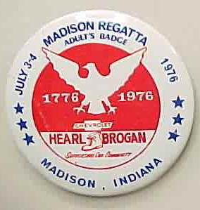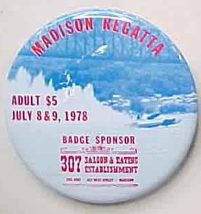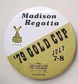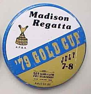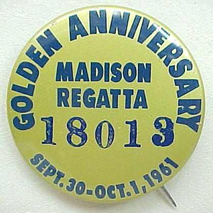 1961 GOLDEN ANNIVERSARY MADISON REGATTA; Sept. 30-oct. 1; 1961. 1.75" diameter tin lithographed pinback button. dark blue on gold. Strong colors! no flaws. 8.50