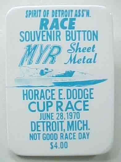 2.25" by 3" rectangular celluloid pinback button. sky blue on white. SPIRIT OF DETROIT ASS'N; RACE SOUVENIR BUTTON; MYR SHEET METAL; HORACE E. DODGE CUP RACE; JUNE 28; 1970; DETROIT; MICH.; NOT GOOD RACE DAY. $4.00. Illustration of MYR SHEET METAL Hydroplane race boat. Colors are strong and bright. mint. 8.50