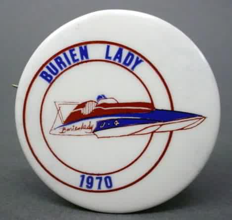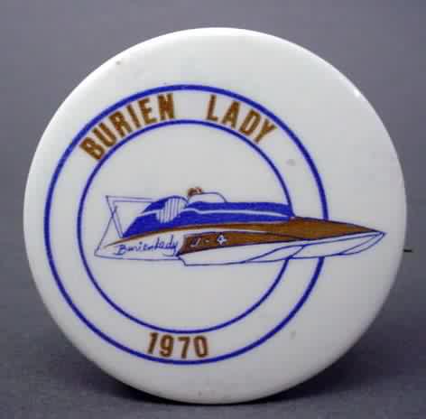 1970 Blue Deck BURIEN LADY unlimited hydroplane pinback button. The boat has a blue deck with reddish brown cowl. The lettering is blue; the rings are reddish brown. 2.25" diameter celluloid pinback button. colors are very strong and bright. no rust. no flaws. near mint to mint. sorry sold