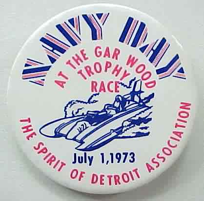2.25" diameter celluloid pinback button. red; white; blue. NAVY DAY AT THE GAR WOOD TROPHY RACE; JULY 1; 1973. THE SPIRIT OF DETROIT ASSOCIATION. Illustration of U-71 Hydroplane race boat. Colors are strong and bright. no flaws. 6.00