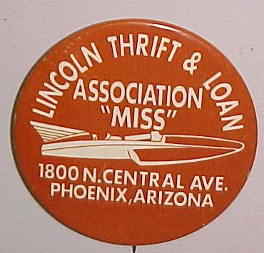 1968 LINCOLN THRIFT & LOAN ASSOCIATION “MISS”. 1800 N. Central Ave. Phoenix Arizona. 2.25" pinback button; Tin lithographed; bright and vivid. There is a small ding from reverse on the 2nd “L” in “Lincoln”. Displays beautifully. excellent plus to near mint. 8.00