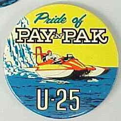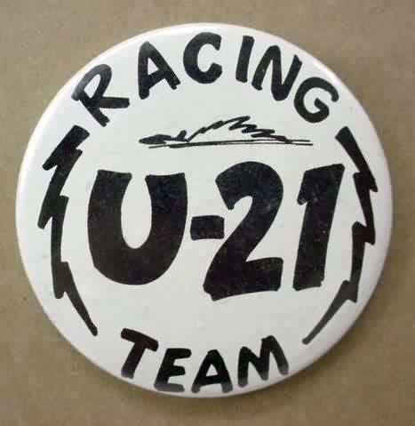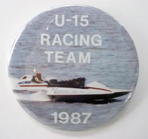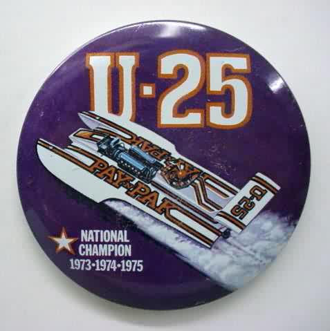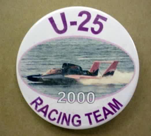 2000 U-25 RACING TEAM white background hydroplane pinback button. 2.25" diameter celluloid. Reverse is clean; no rust. colors bright and vivid. no flaws. superior condition. 11.00