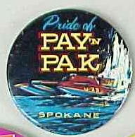 Black on gold. PITS; GOLD CUP RACE; AUG. 1-8; 1965. SEATTLE; WASH. Has Seattle Seafair logo on each side of the race boat. Has round black on pink SKIP sticker. 3" by 2" with plastic slipcase with pinback on reverse. VERY SCARCE. excellent. 12.50