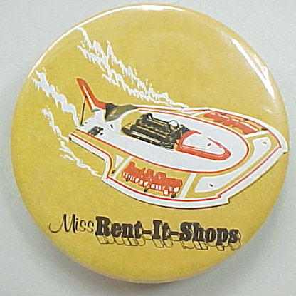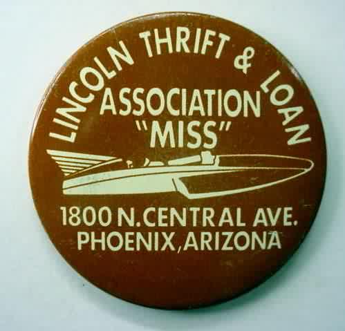 1968 LINCOLN THRIFT "MISS" hydroplane pinback button. White on brown. 2.25" tin litho. reverse is clean; no rust. no flaws. colors are strong and vivid. Superior condition. not a scarce pin; but rarely found this nice. 8.50