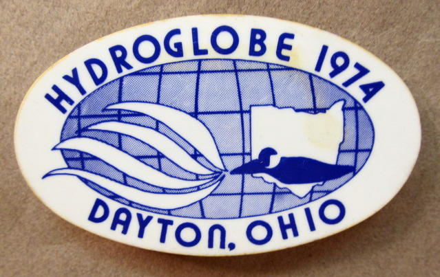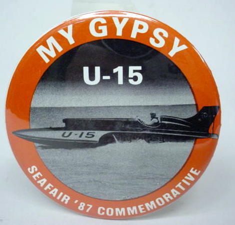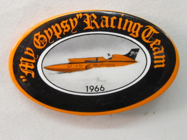 1966 MY GYPSY RACING TEAM hydroplane pin. Oval shape. 1.75" by 2.75" celluloid pinback button. reverse is clean. no flaws. mint. 25.00