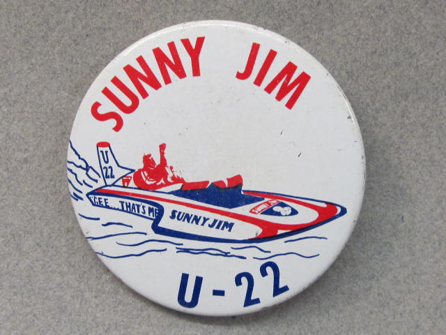 1973 SUNNY JIM tin litho GEE THAT'S ME hydroplane pinback button. red and blue on white. Not a rare pin by any means; but very hard to find this nice! 2.25" diameter tin litho. Reverse is clean; no rust. colors bright and vivid. no flaws. superior condition. 4.00