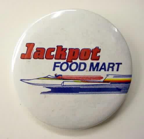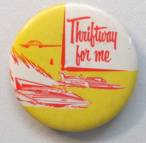 1960 THRIFTWAY FOR ME. red and yellow and white. shows boat racing. designed like face of starter's watch. a hair over 2" diameter. celluloid pinback. reverse is clean. no flaws. excellent to near mint. 22.50