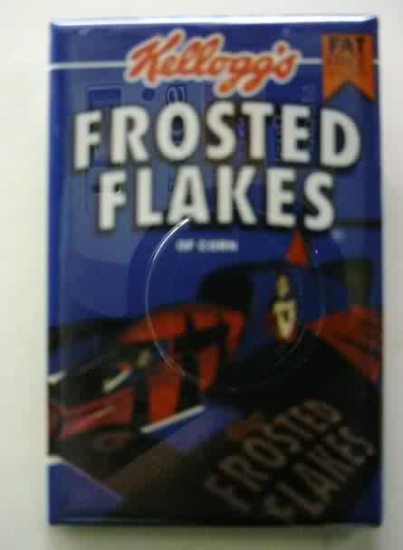 1993 KELLOGG'S FROSTED FLAKES rectangle blue hydroplane pinback button. 2.75" by 1.75" celluloid. reverse is clean; no rust. no flaws. colors strong and bright. Superior condition. 8.50
