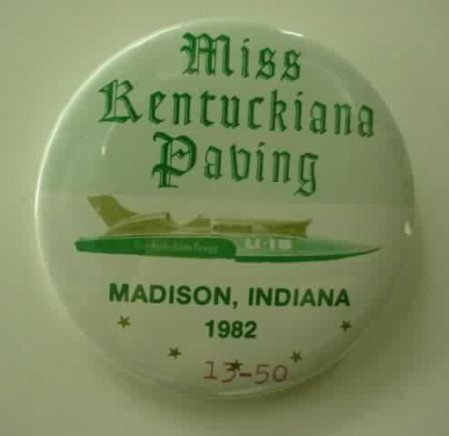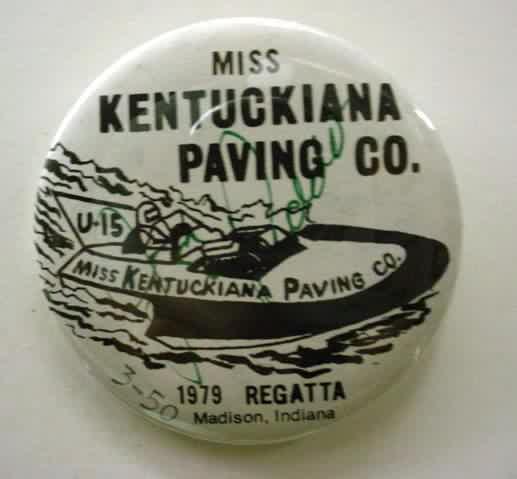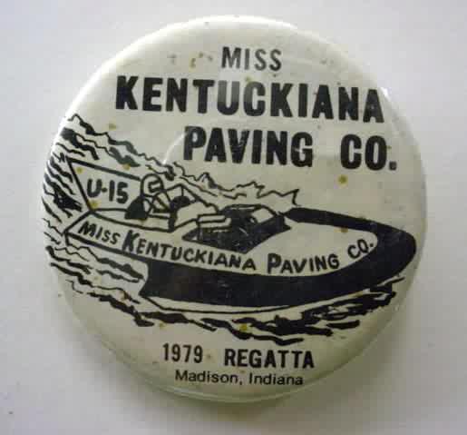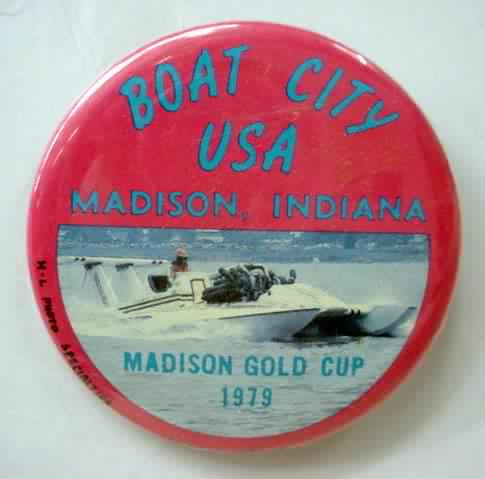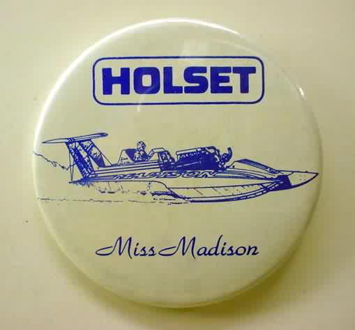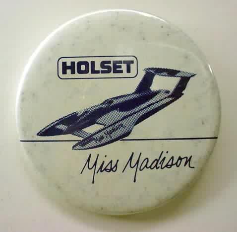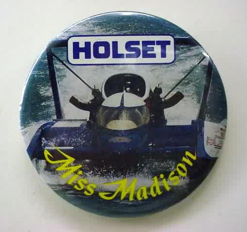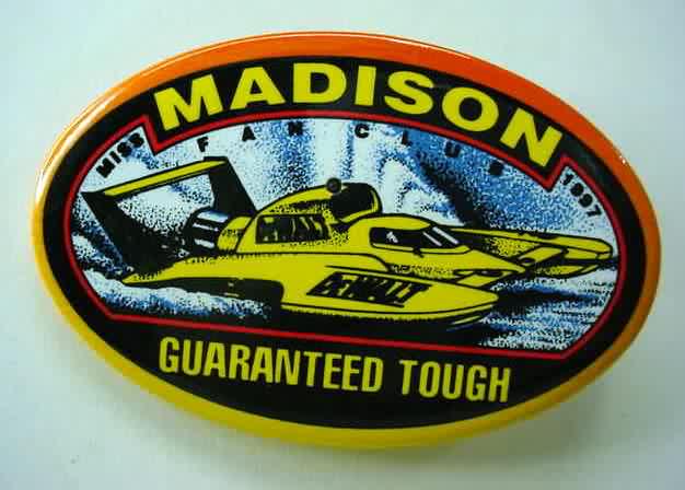 1999 MISS MADISON SEDAN CONTRACTING CORP. hydroplane pinback. full color action photo in the center; red border. approx. 3" diameter celluloid. reverse is clean; no rust. no flaws. no flaws. superior condition. 6.00
