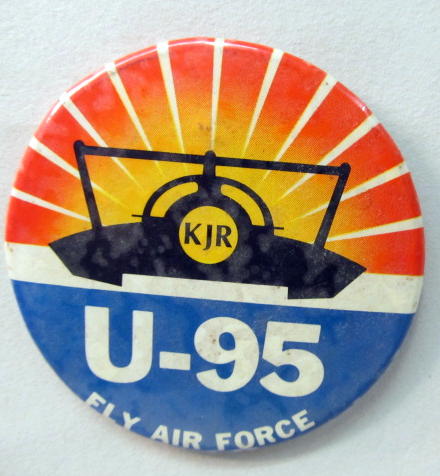 large KJR U-95 FLY AIR FORCE. colorful. 3.5" diameter celluloid. excellent. 3.00