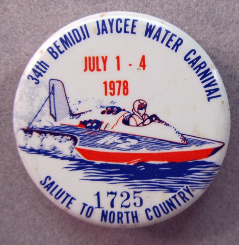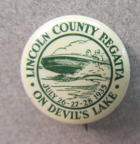 July 1935 LINCOLN COUNTY REGATTA on Devil's Lake. green on white. 7/8" diameter celluloid pinback button. illustration of speed boat. near mint. early and scarce! 89.50