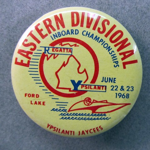 1968 EASTERN DIVISIONAL WORLD CHAMPIONSHIP Inboard Championships. Ypsilanti. red and blue on yellow. 2.25" celluloid pinback button. Limited Hydroplane racing. Made in Winona Minnesota. no flaws. mint. scarce. 28.50