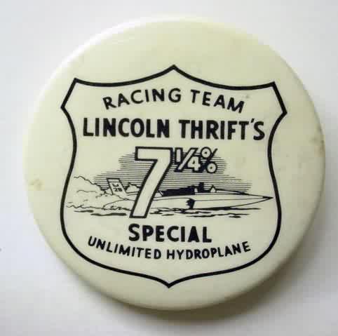 1971 LINCOLN THRIFT RACING TEAM hydroplane pinback button. black on white. shield shaped crest with "7 1/4%". 2.25" diameter celluloid. reverse is clean; no rust. Near mint. 12.00