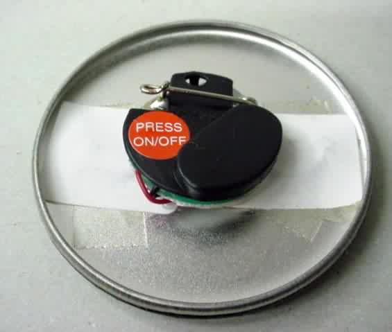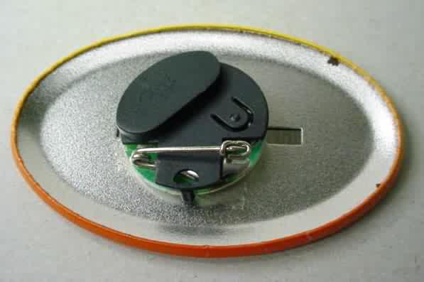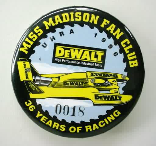 1996 MISS MADISON FAN CLUB - DEWALT electronic numbered #0018 hydroplane pinback. Yellow lettering; black border; illustration of the boat in center. Has electronic doodad on back; there are 3 lights on the boat that are supposed to flash. The battery is long past it's life expectancy. approx. 2.25" diameter celluloid. reverse is clean; no rust. no flaws. no flaws. superior condition (but battery is dead). sorry sold