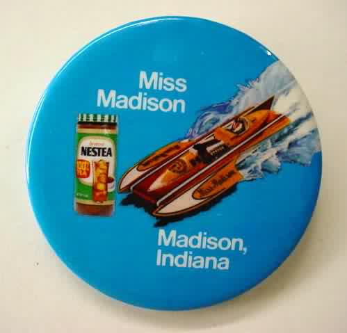 1973 MISS MADISON with One Jar of NESTEA hydroplane pinback. blue background. approx. 2.25" diameter celluloid. reverse is clean; no rust. no flaws. superior condition. 6.00