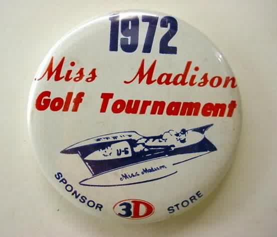 1972 MISS MADISON GOLF TOURNAMENT hydroplane pinback. Red and blue on white background. approx. 1.75" diameter celluloid. reverse has very light surface darkening. no flaws. superior condition. 9.50