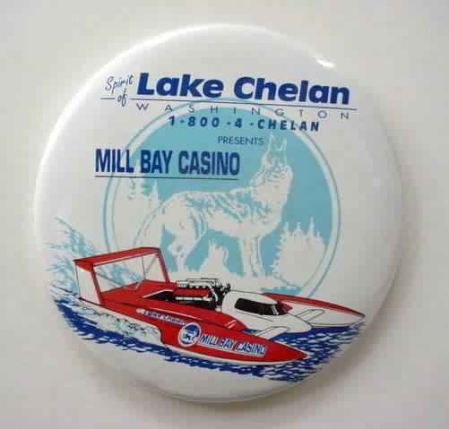 1999 MILL BAY CASINO - SPIRIT OF LAKE CHELAN hydroplane pinback button. 3" diameter celluloid. reverse is clean; no rust. no flaws. colors strong and bright. superior condition. 4.00