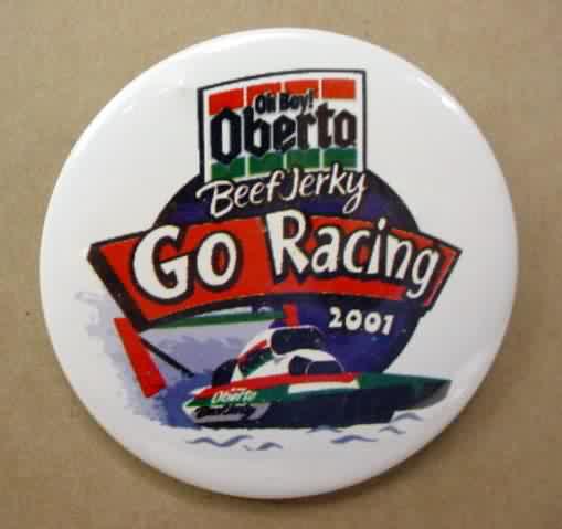 2001 OBERTO GO RACING hydroplane pinback button. 2.25" diameter celluloid. Reverse is clean; no rust. colors bright and vivid. no flaws. superior condition. sorry sold