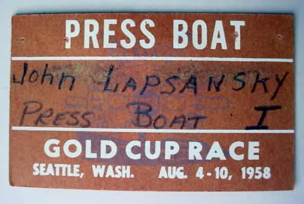 1958 SEATTLE SEAFAIR PRESS BOAT Pass. approximately the size of a business card. made out to JOHN LAPSANSKY PRESS BOAT I. minor staple holes. 14.50