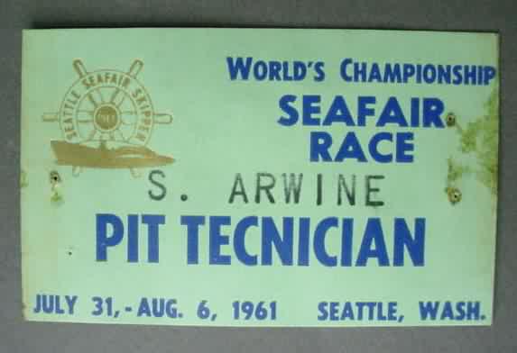 1961 SEATTLE SEAFAIR PIT TECHNICIAN Pit Pass. approximately the size of a business card. made out to S. ARWINE. some staining. No creases. 12.00
