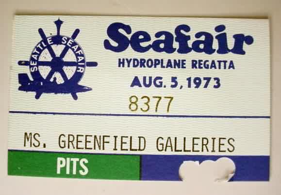 MS. GREENFIELD GALLERIES 1973 Seafair Pit Pass. approximately the size of a business card. 10.00