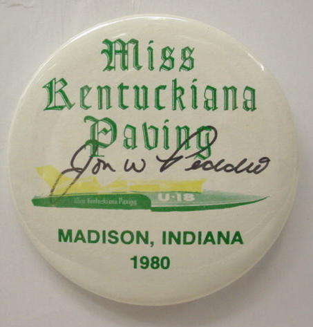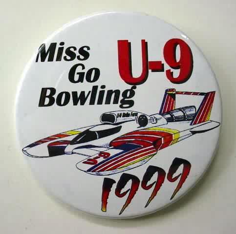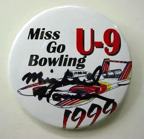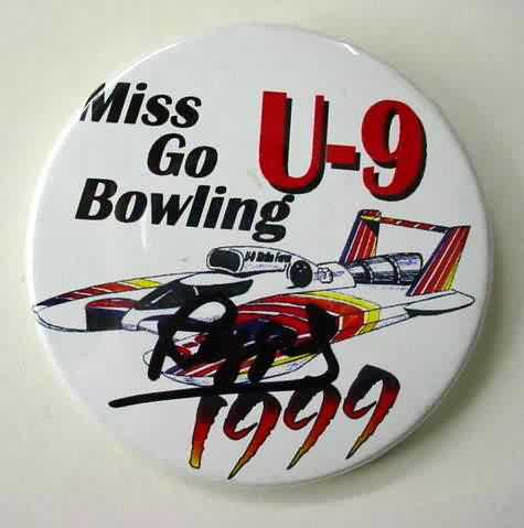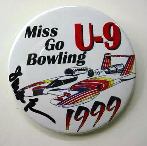 set of 4 autographed 1999 MISS GO BOWLING hydroplane pinback buttons. color illustration of the U-9 on white. all 4 are the same button; but 3 of them are autographed in black sharpie on TOP of the celluloid. possibly unique. The first photo is the normal issued pin without a signature. 2nd one is signed (I think) REGGIE; the next is "MICHAEL HANSEN" or something similar; the last is signed - but I am not sure by who. Sorry; but I am not familiar with this race team. Signatures were obtained in person; at the pits; by original owner. 2.25" diameter celluloid. reverse is clean; no rust. no flaws. superior condition. 39.50