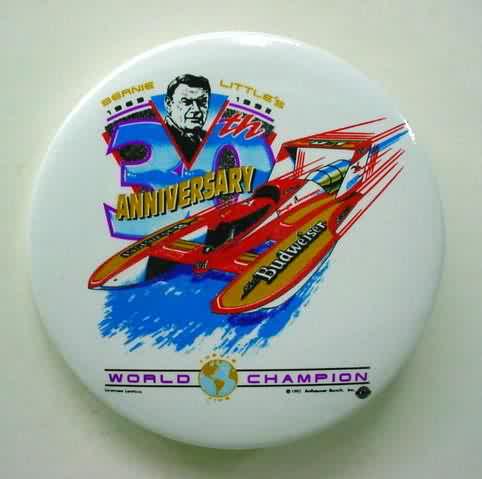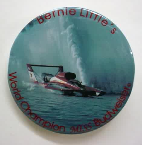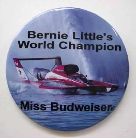 1993 MISS BUDWEISER Bernie Little's World Champion celluloid hydroplane pinback button. full color photo with RED lettering. 2.5" diameter celluloid. reverse is clean; no rust. no flaws. superior condition. 23.00