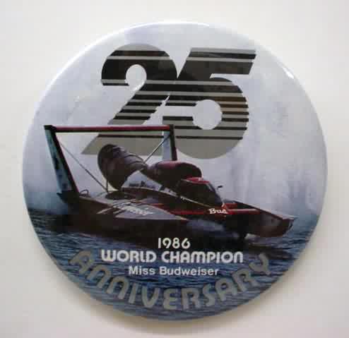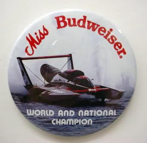 1993 MISS BUDWEISER Bernie Little's World Champion celluloid hydroplane pinback button. full color photo with black lettering. 3" diameter celluloid. reverse is clean; no rust. no flaws. near mint to mint condition. 4.50