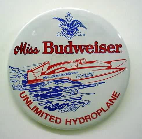 MISS BUDWEISER. "Hydro Fans ... This Bud's For You". color on red/white/blue. 2.25" celluloid. mint. 2.00