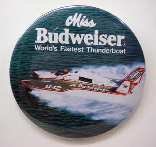 1968. red & gold on white. MISS BUDWEISER U-12 unlimited hydroplane pinback button. 2.25" diameter tin lithographed pinback button. colors are very strong and bright. no rust. no flaws. very clean. hard to find nice examples of this pin. near mint plus. 8.00