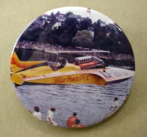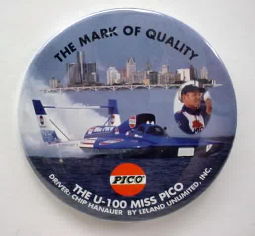 1999 MISS PICO U-100 hydroplane pinback button. full color photo of boat with smaller inset photo of Hanauer. 3" diameter celluloid. reverse is clean; no rust. colors bright and vivid. no flaws. superior condition. 4.00